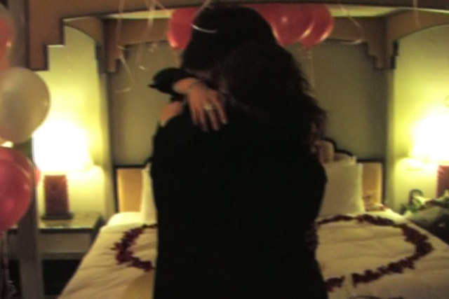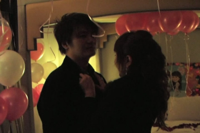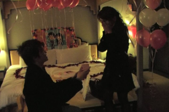 他示意她往前走,家嫿這才發現整間房間都佈置了滿滿的粉紅色與白色相間的氣球,她看見床上有個玫瑰花瓣鋪成的愛心,裡面擺了一個大蛋糕。已經完全無法思考的她,掀開蛋糕蓋,看見自己和男友的照片美美地印在蛋糕上,左邊似乎還寫著什麼小字。一回頭,發現男友手上拿著一大束花,她覺得迷惑,房間的背景音樂旋律有些熟悉 " 春暖的花開,帶走冬天的感傷...."。