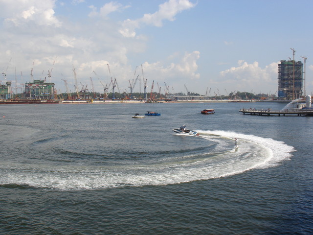 昨天在新加坡河附近的照片。有人在滑水,背景是近來相當有財務狀況 大興土木中的金沙賭場